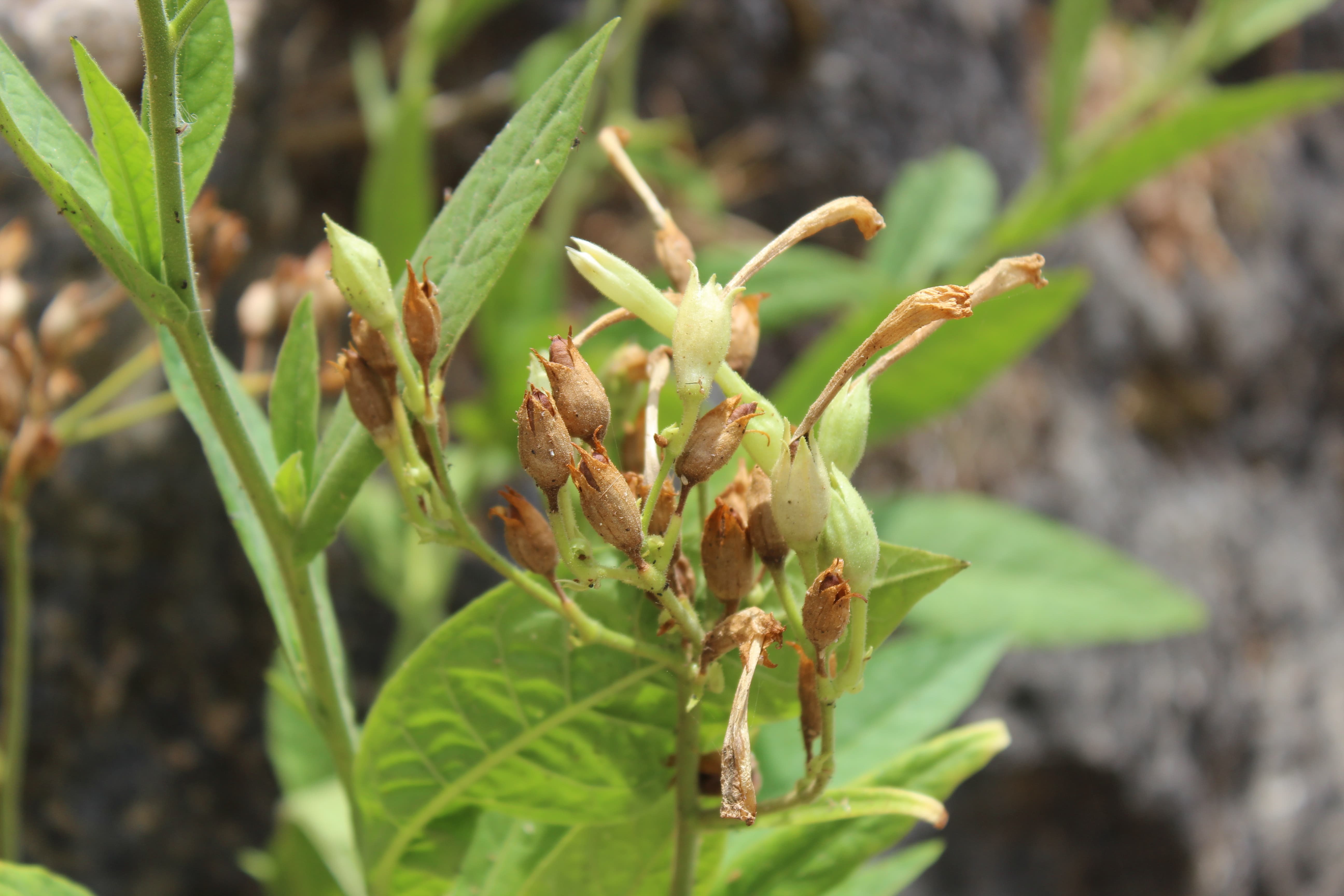 Annual or sometimes perennial herb . Leaves ovate to elliptic or lanceolate . Flowers long tubular , yellowish , greenish , red or pink , viscid-glandular outside . Fruit capsule , glabrous , brown , elliptic or ovoid . Seeds ellipsoid , ovoid , globose . (Ref . POWO , 2021) .