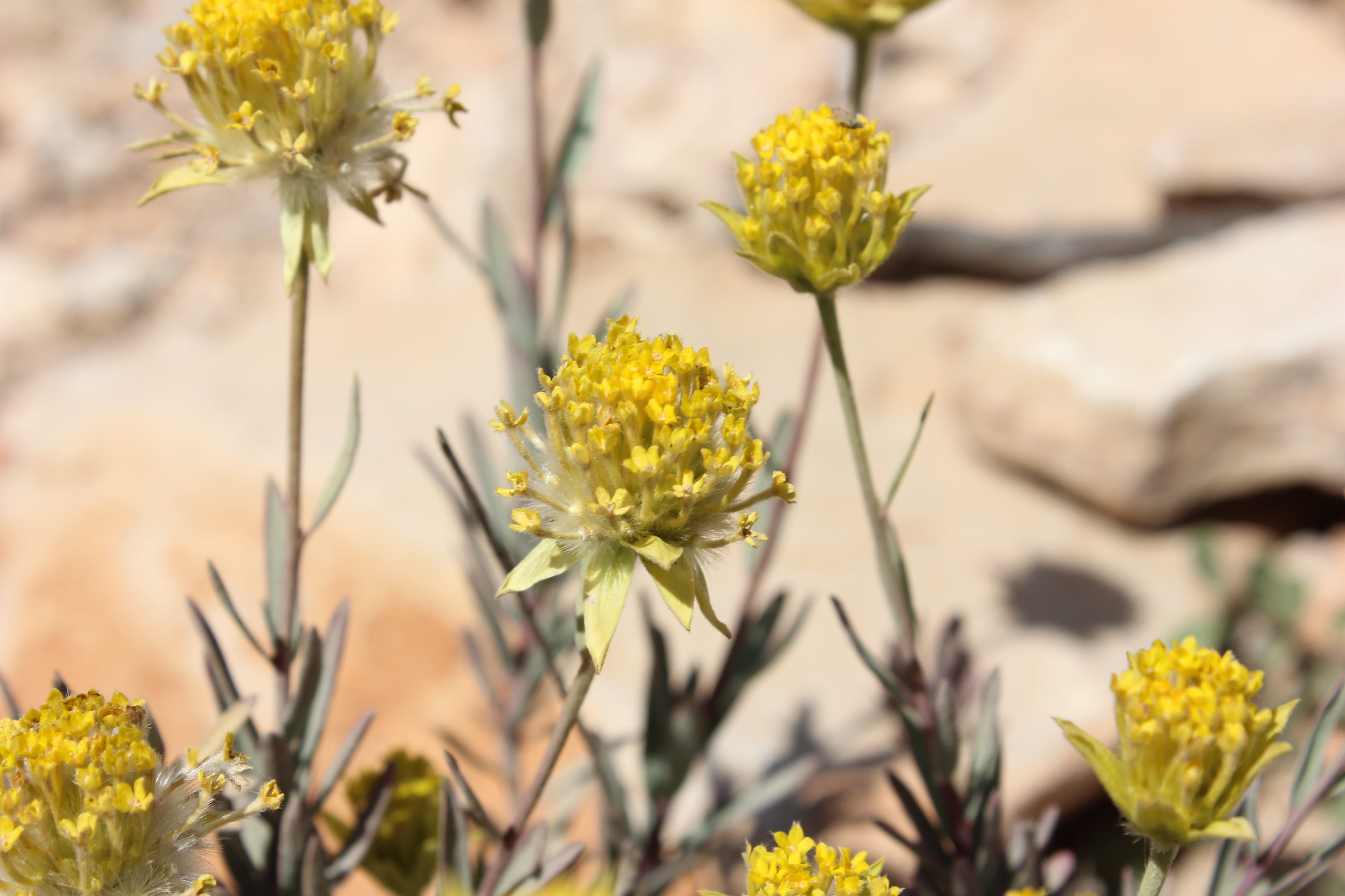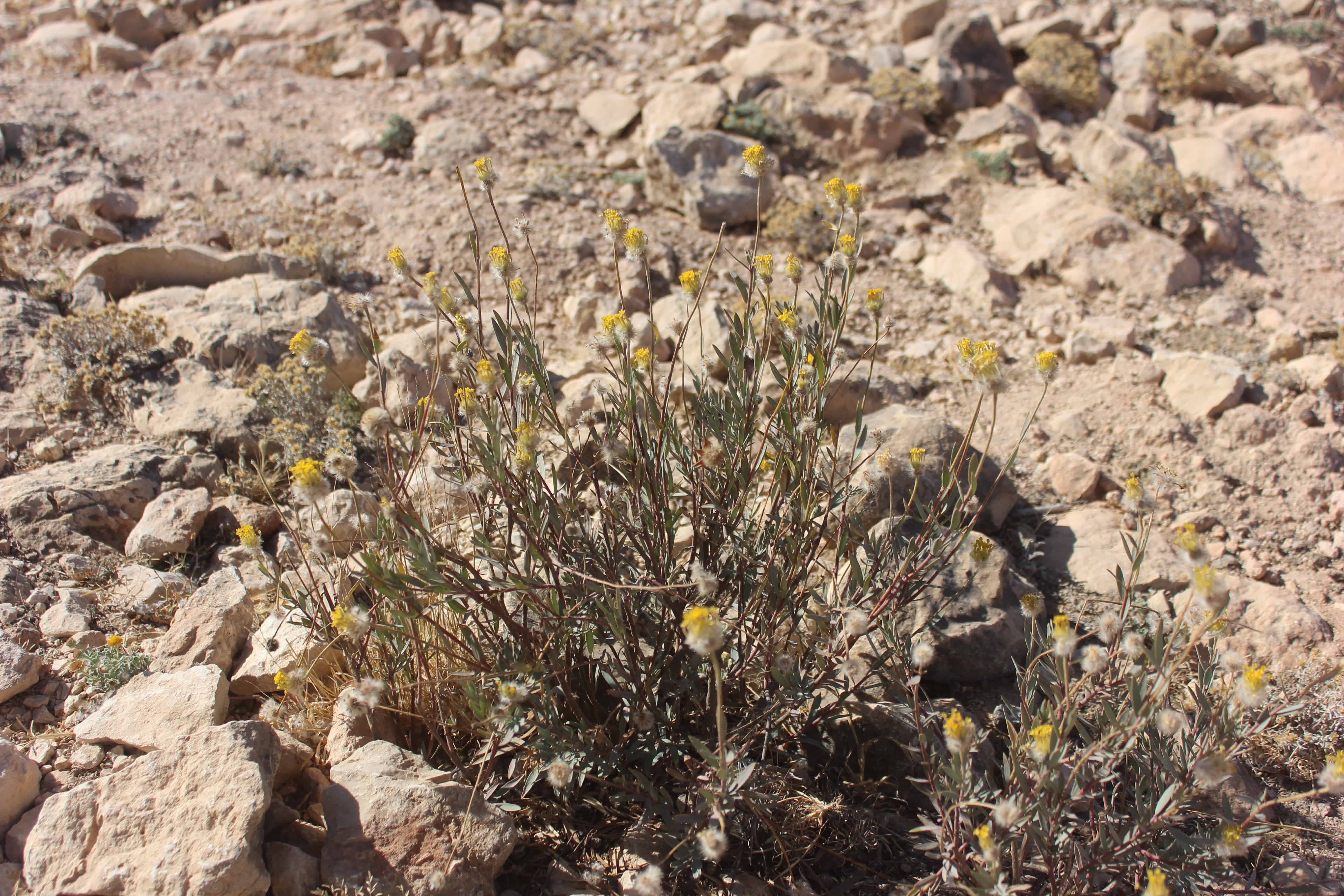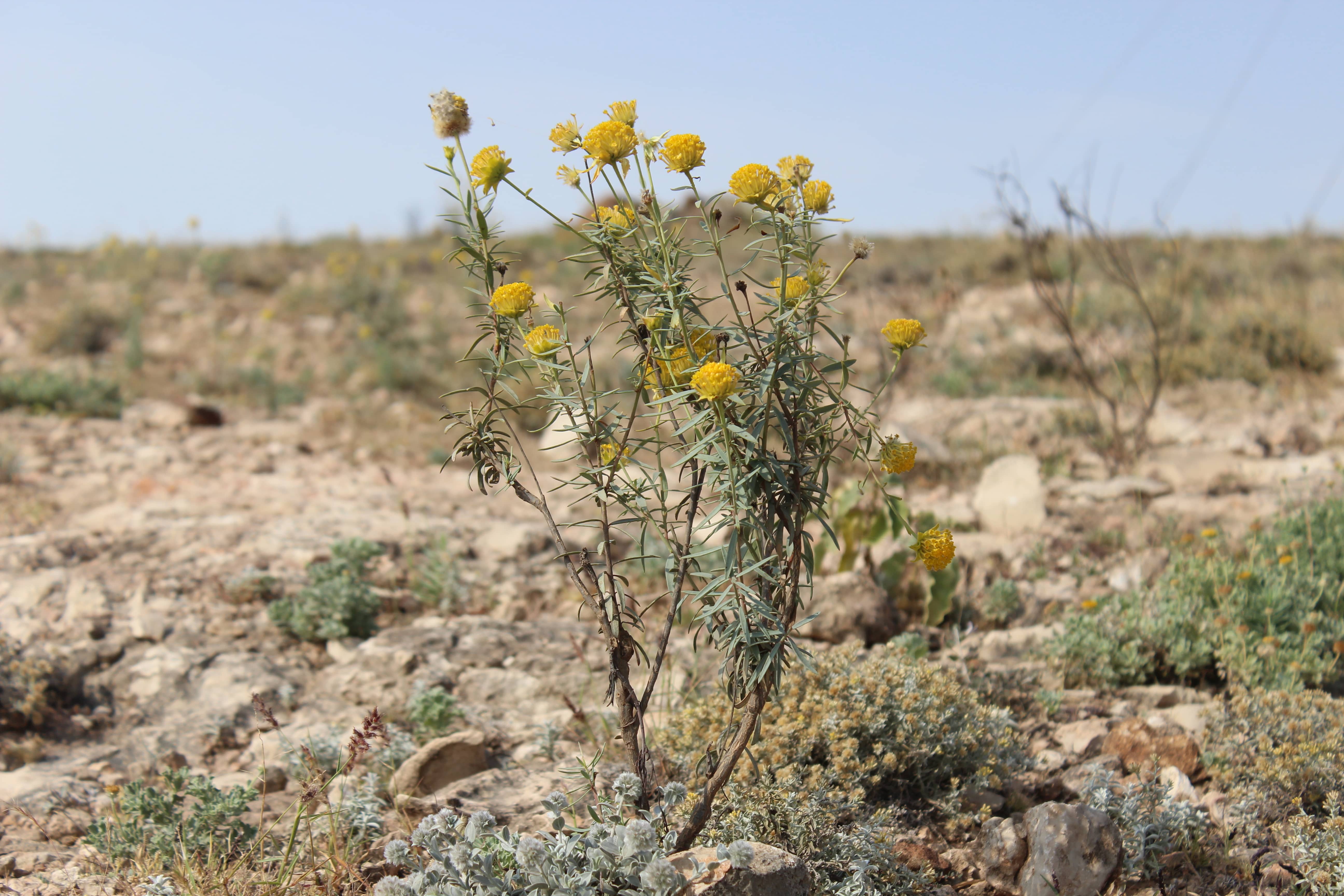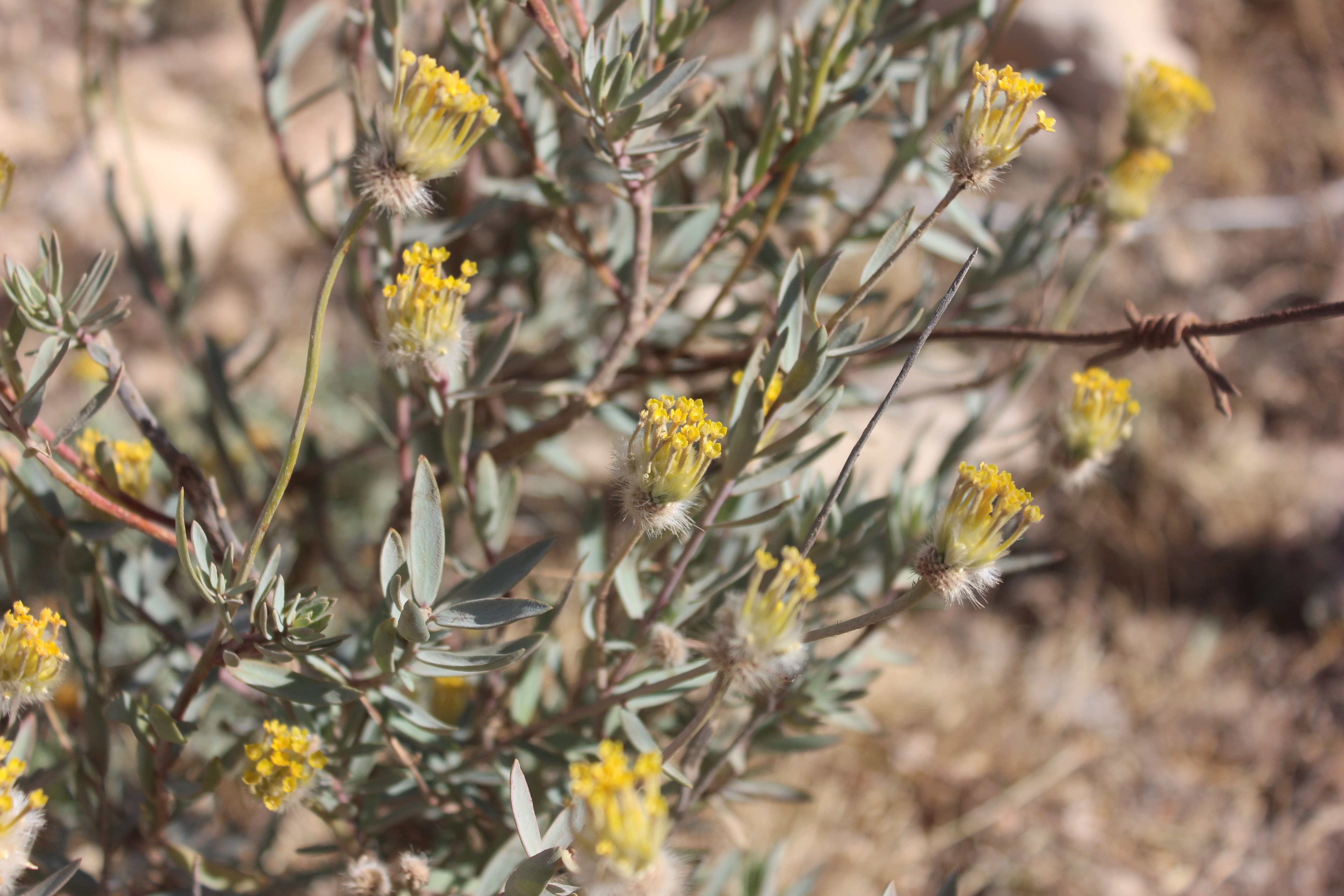 Low shrub ; up to 80cm . Branching from the base , very sparsely pilose . Leaves alternate , sessile to subsessile , grey-green , linear-lanceolate , entire , apex acute to mucronate , base tapering , glabrous . Flowers yellow , in terminal heads ; petals absent .
