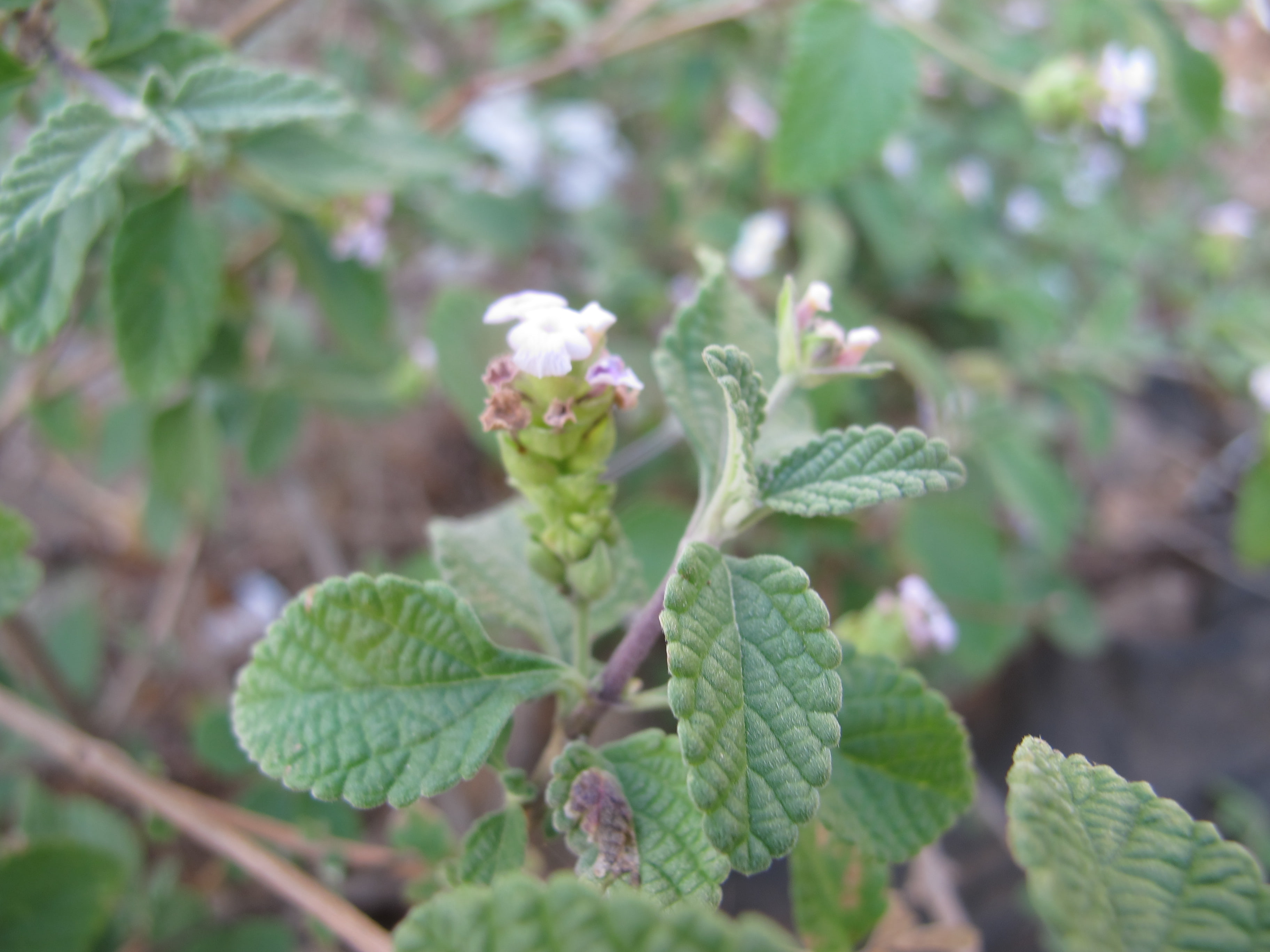 Shrub ; up to 1 m . Stems 4-angled , hispid with retrorse adpressed , bulbous-based hairs . Leaves opposite , mid-green above , greenish-white beneath , ovate , base truncate to sometimes cuneate , apex obtuse , margins dentate , hispid , veins prominent beneath . Flowers in axillary condensed bracteolate spikes , cylindrical ; corolla pink fading white , more/less 2-lipped , tubular , unequally 5-lobed above . Fruit a fleshy drupe , black when ripe , enclosed by the persistent calyx .